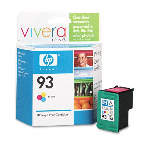 Compatible HP models: Deskjet: 5420v, 5440, 5440v, 5440xi, 5442, 5443, D4145, D4155, D4160Photosmart: 7850, 7850v, 7850xi, C3110, C3125, C3135, C3140, C3150, C3170, C3173, C3180, C3183, C3188, C3190, C3193, C3194, C4140, C4150, C4180Photosmart Pro B8350PSC: 1510, 1510s, 1510v, 1510xi Yields up to 220 pages. HP Vivera ink technology produces vivid, consistent color for true-to-life photos and crisp laser-quality documents. Extensively tested for purity, color quality, durability and reliability, HP inkjet cartridges using Vivera ink technology are designed to resist fading, smudging and bleeding. Specially formulated cartridges are designed to work flawlessly with your HP printer and with all types of paper so you get exceptional results each and every time. Greener choice - contains 48% postconsumer recycled content. The information contained herein is subject to change without notice. The only warranties for HP products and services are set forth in the express warranty statements accompanying such products and services. Nothing herein should be construed as constituting an additional warranty. HP shall not be liable for technical or editorial errors or omissions contained herein. HP Ink, Toner & Ribbons part of a large selection of printer ink and toner. HP 93, Tricolor Ink Cartridge (C9361WN) is one of many Ink, Toner & Ribbons available through Office Depot. Made by HP.