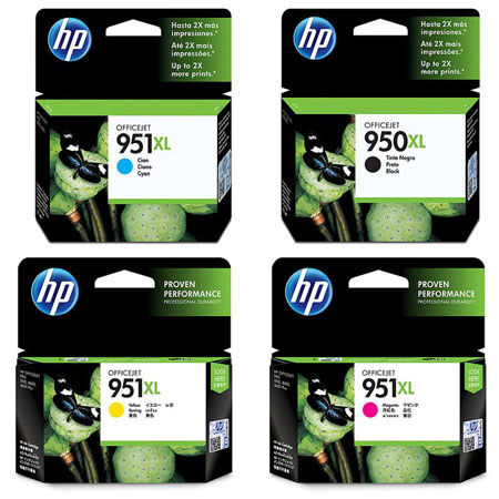 Overview HP 950-951 XL Four Pack Black & Color Inkjet Ink Set, Save more with our 4 pack compatible Hewlett Packard (HP) ink HP 950XL & HP 951XL cartridges: This set includes 1 black CN045AN, 1 each of cyan CN046AN, magenta CN047AN, and yellow CN048AN inkjet cartridges. Why pay twice as much for brand name OEM HP printer ink cartridges when our compatible printer supplies deliver excellent quality results for a fraction of the price! Our compatible brand replacement inkjet cartridges for your HP printer are backed by a full 1 year 100% satisfaction guarantee. For use in the following printers: OfficeJet Pro 8100, OfficeJet Pro 8600, OfficeJet Pro 8600 Plus, OfficeJet Pro 8600 Premium.